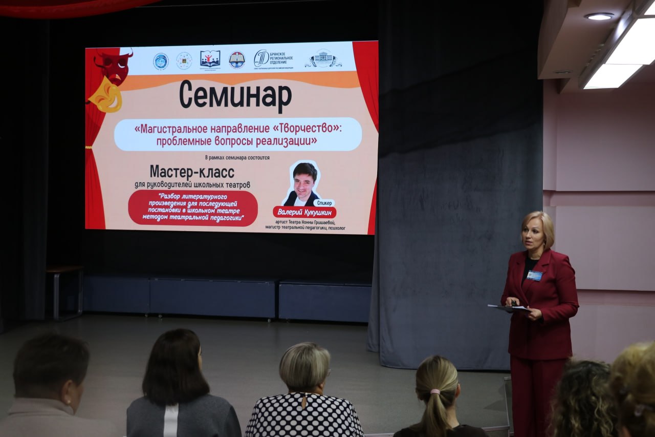 8 октября 2025 года состоялся региональный семинар «Магистральное направление «Творчество»: проблемные вопросы реализации», организованный ГАУ ДПО «БИПКРО» совместно с ГБУДО «Брянский областной губернаторский Дворец детского и юношеского творчества имени Ю.А. Гагарина». В работе семинара приняли участие муниципальные ответственные за реализацию проекта, руководители школьных театров и школьных музеев. По сложившейся традиции семинар открыла Захарова Марина Владимировна, проректор по учебно-методической и проектной деятельности ГАУ ДПО «БИПКРО», региональный ответственный за реализацию проекта «Школа Минпросвещения России», которая в своем выступлении представила итоги самодиагностики по ключевому направлению «Творчество», уделив особое внимание созданию условий в образовательных организациях, способствующих максимальной реализации потенциала обучающихся (успешное развитие интеллекта, таланта, творческих способностей, формирование созидательной личности).